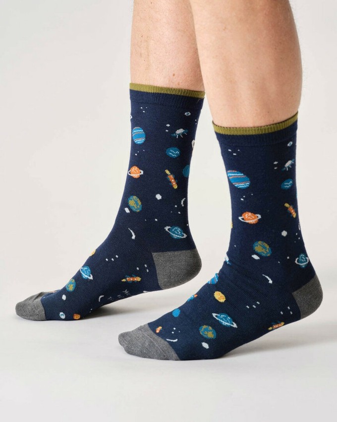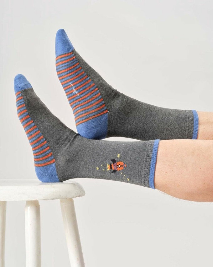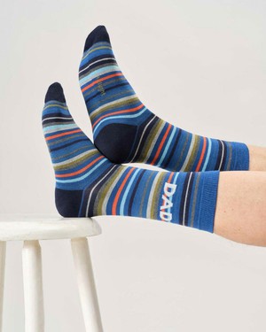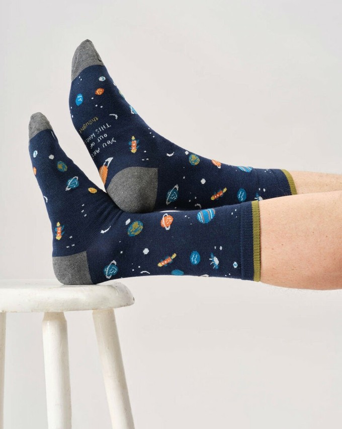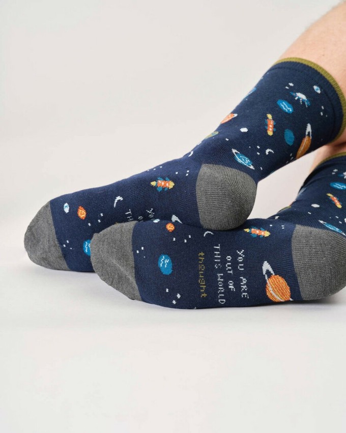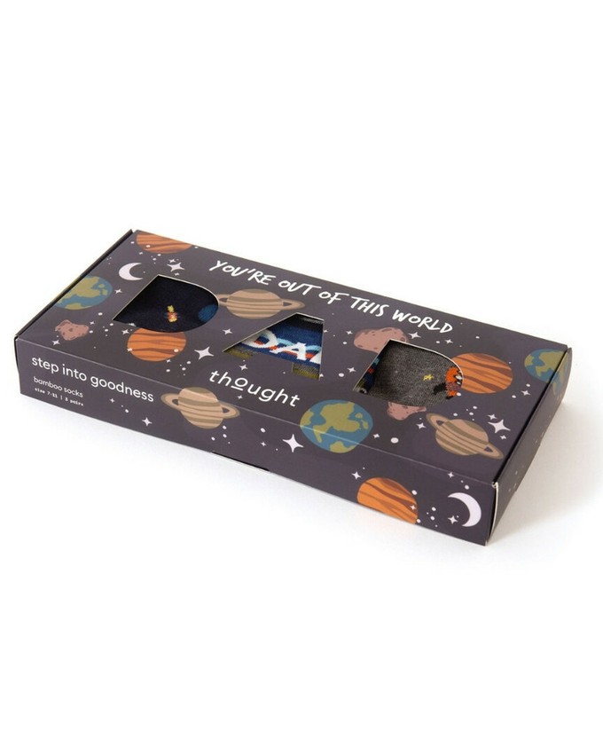Thought sokken cadeaudoos - You’re Out of This World DadDe Thought You’re Out of This World Dad Giftbox is een luxe cadeaudoos met drie paar herensokken in maat 41 tot 45. De sokken zijn versierd met vrolijke ruimtevaartprints: kleurrijke planeten, een raket en een speels gestreept paar met de tekst DAD. Samen vormen ze een originele en persoonlijke set die ideaal is om cadeau te geven aan vader.