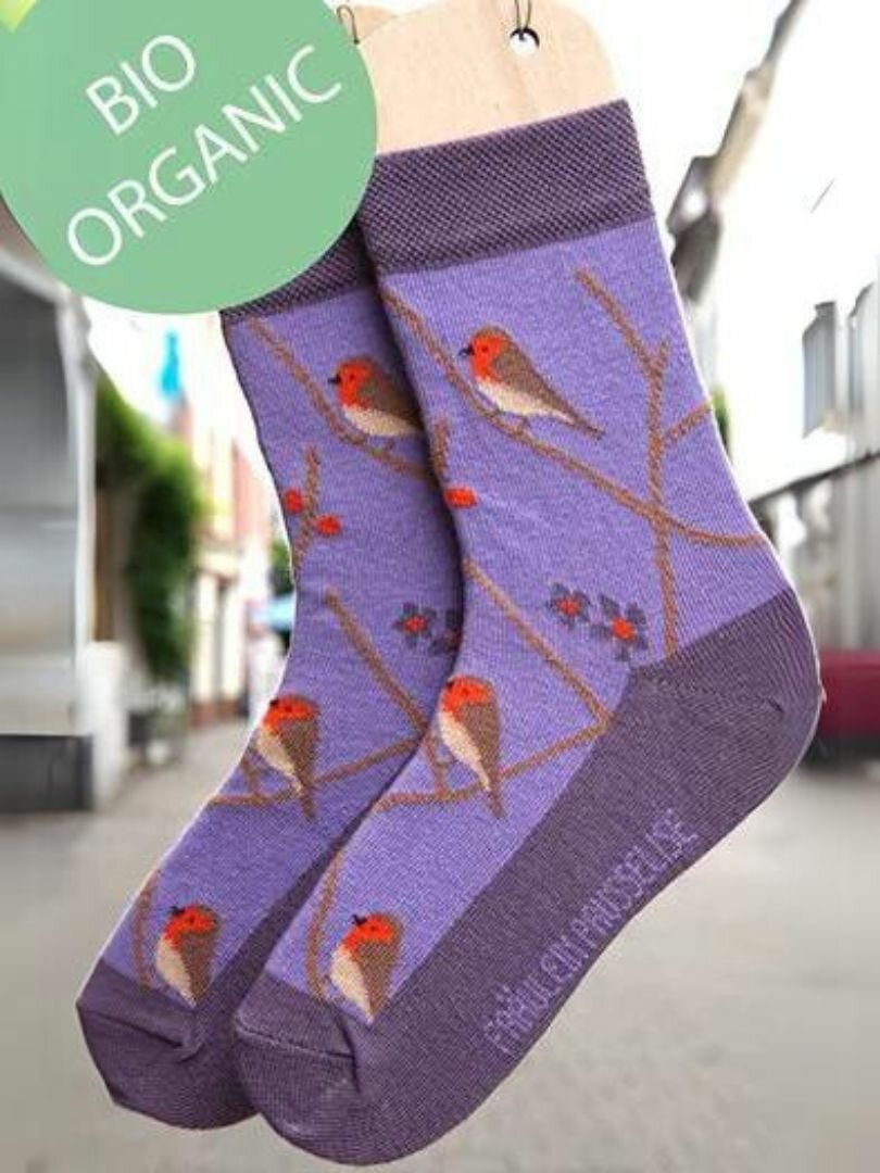 Op deze leuke lila katoenen kindersokken van Fräulein Prusselise staan roodborstjes. Bij kinderen zijn sokken met vogels en andere dierenprints favoriet.