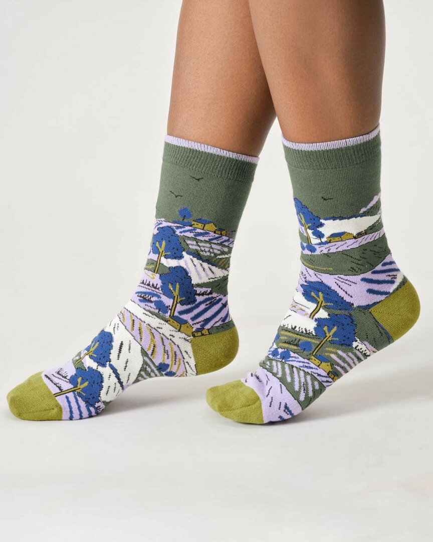 Deze katoenen damessokken van Thought in eucalyptusgroen hebben een levendige print van een uitgestrekt landschap. Met speelse details en gelaagde kleuren brengen de sokken een vleugje natuur tot leven op je voeten. Gemaakt van zacht biologisch katoen en gerecyclede materialen combineren ze een opvallend ontwerp met het vertrouwde Thought-comfort. Een sok die gezien mag worden, of je nu binnen blijft of de deur uitgaat.