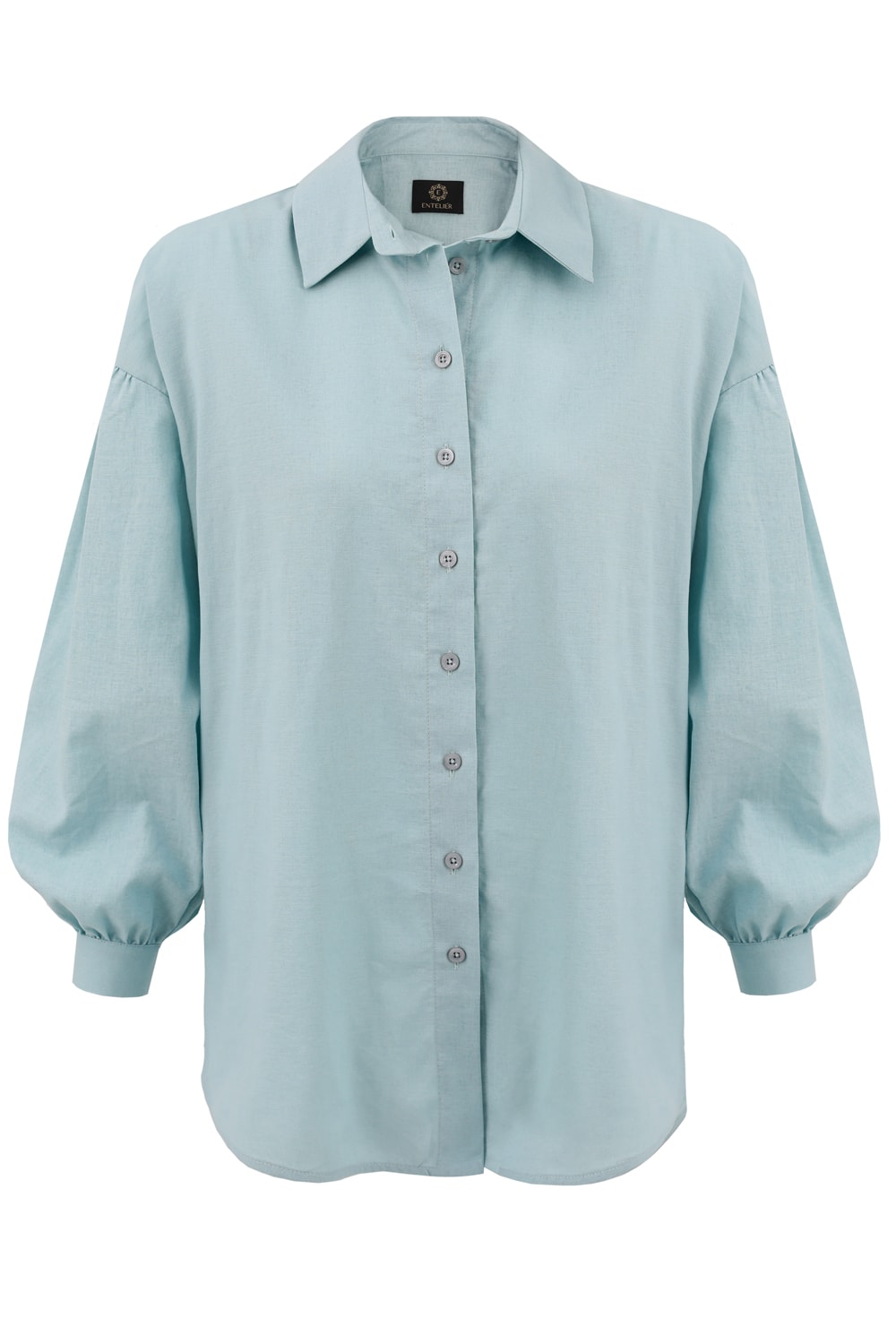 The Summer linen shirt pale turquoise is a loose oversized shirt. The shirt has dropped shoulders, a rounded hem, slightly gathered puff sleeves finished with an elegant single-button cuff. The shirt has natural pearl buttons. It is made of linen, cotton and viscose fabrics. The shirt is perfect for summer, with trousers or shorts.