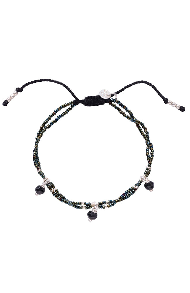 Twee armbandjes (16-22 cm) van A Beautiful Story die bestaan uit een combinatie van glaskralen, messing kralen en kleine labradoriet edelsteentjes, geregen op draad. De armband heeft een schuifslot van katoendraad. De black onyx edelsteen staat voor vertrouwen, focus en kracht.