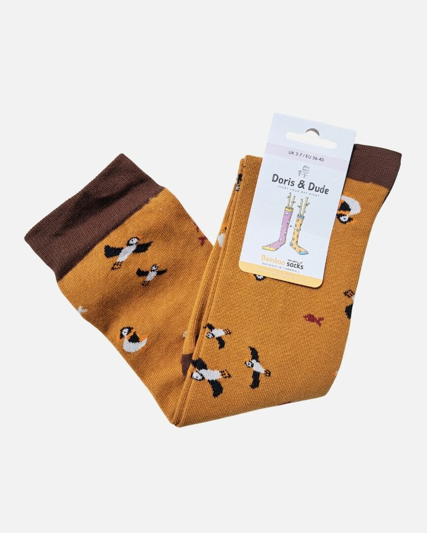 Papegaaiduikers (in het Engels puffins) worden ook wel “de clowns van de zee” genoemd, dankzij hun vrolijke, bijna cartooneske uiterlijk. Met deze kniekousen draag je dus niet alleen comfort, maar ook een vleugje speelsheid aan je voeten.