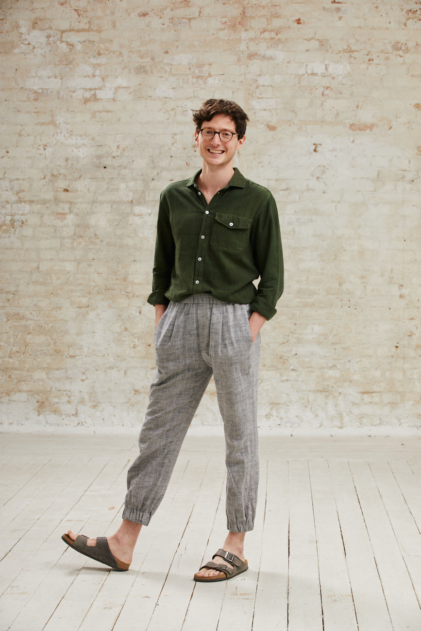 Loose-fitting trousers made of soft, hand-woven cotton fabric with elastic bands at the waist and hem.
