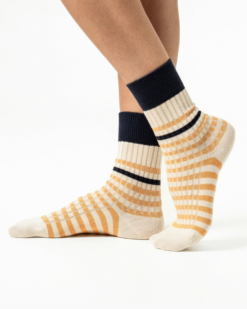 Katoenen damessokken Maris - navy sun yellowDeze Living Crafts sokken Maris vallen op door hun sportieve kleurcombinatie van navy met gele strepen. De donkere, brede boord zorgt voor een stevig accent en geeft de sokken een uitgesproken, maar toch tijdloze uitstraling.