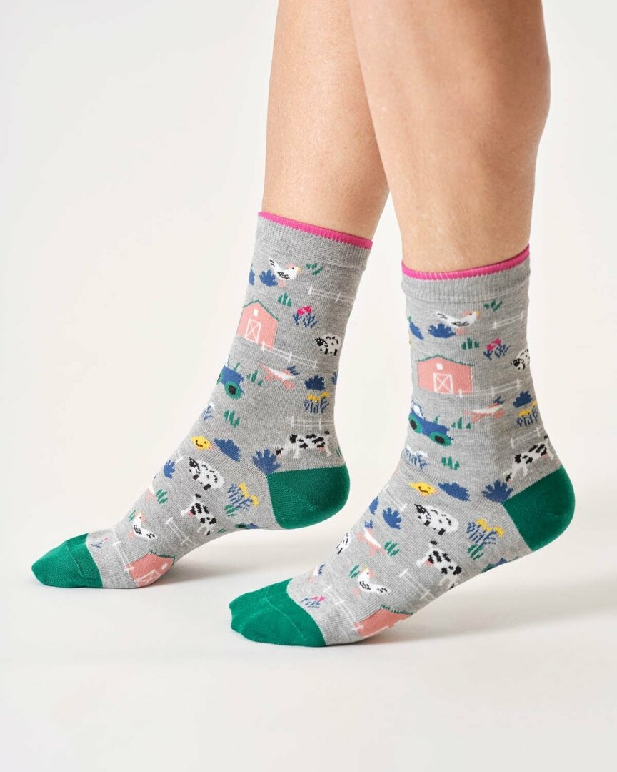 Deze lichtgrijze bamboe damessokken van Thought zijn een vrolijke knipoog naar het boerenleven. De sokken zijn rijk geïllustreerd met kippen, schapen, een tractor en een boerenschuur, en afgewerkt met groene accenten op de teen en hiel en een roze boordje. Dankzij de zachte, ademende bamboevezel dragen ze heerlijk comfortabel. Een sok vol karakter voor wie het buitenleven graag een beetje meedraagt.