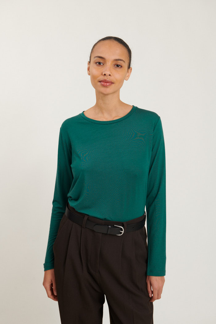 Soepele losvallende longsleeve top van tencel. In een mooie diepe kleur bosgroen (Rain Forest). Leuk als extra laagje, maar ook erg fijn onder een vest of colbert. Rechte fit, lange mouwen en een ronde hals.