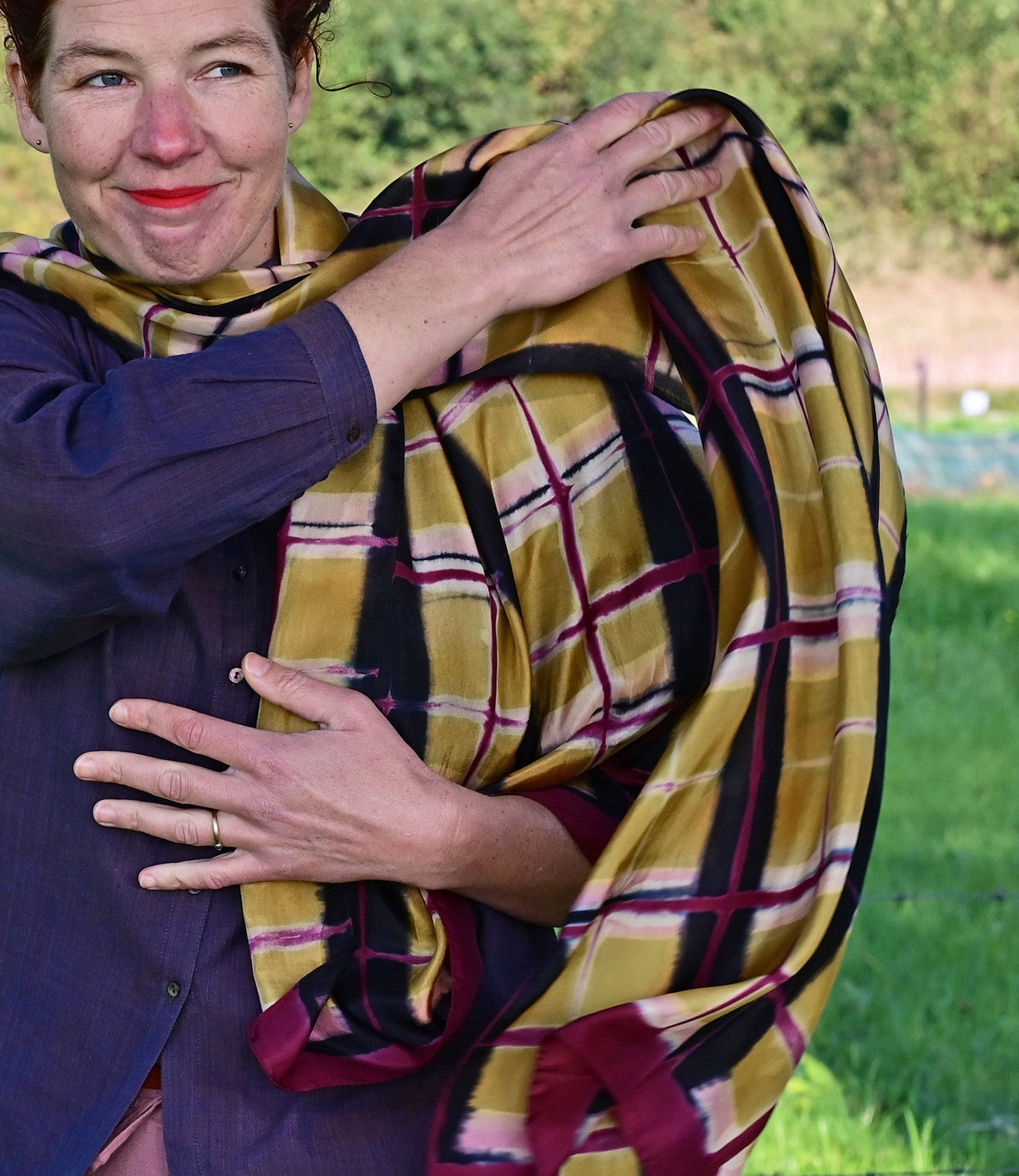 Itajime ofwel clamp dyeDeze sjaal is gemaakt met de clamp dye techniek, ook wel itajime genoemd. De stofkeuze hiervoor is belangrijk: licht genoeg om meerdere keren te vouwen en de kleur toch tot de binnenste plooien te laten doordringen.