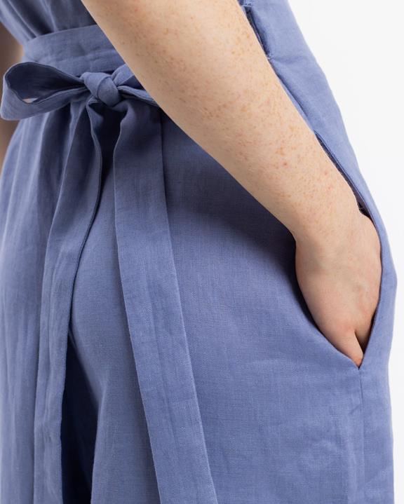 Zomerse jumpsuit van een lichte linnen-katoenmix in lichtblauw, geweven in Portugal. De extra wijde pijpen zorgen voor veel bewegingsvrijheid en een relaxt gevoel. De praktische riem kan zowel voor als achter gestrikt worden. Voorzien van handige steekzakken en verstelbare bandjes.