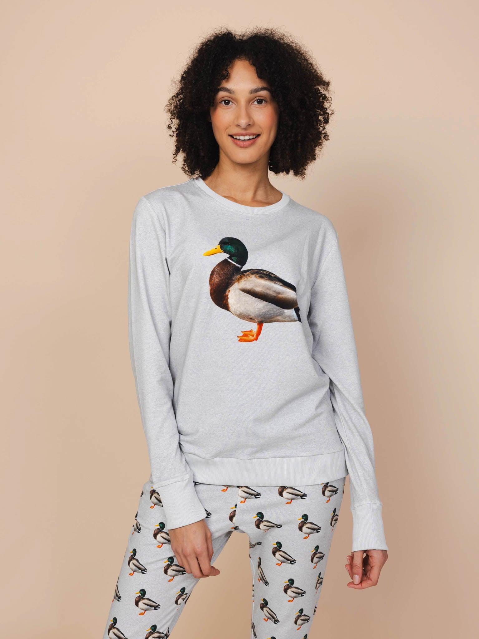 Of je nu lekker op de bank ligt of wat door het huis waggelt, deze eend blijft / deze eendjes blijven gezellig in je buurt. Het lichtgrijze mêlee geeft de outfit een extra relaxte uitstraling. Je kan er ook heerlijk in slapen en morgen weer uitgerust ontkwaken.