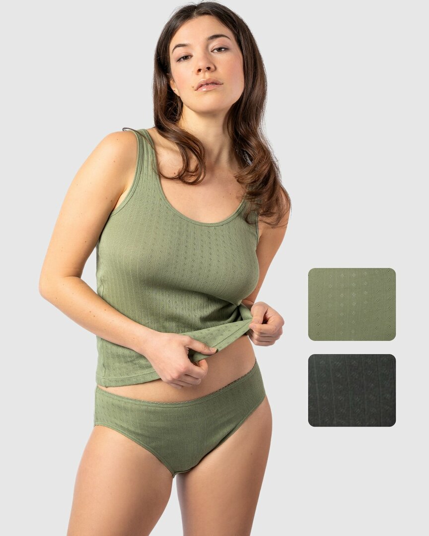 Deze fijne damesslips van 100% biologisch katoen dragen aangenaam zacht en luchtig. De slips in fijne rib hebben een ajourbreisel. Door deze breitechniek ontstaat een rekbare stof. De elastische biezen aan de tailleband en beenopeningen zorgen voor een hoog draagcomfort. De slips zijn verkrijgbaar als 2-pack met een slip in de kleur fog green en een in kaki.