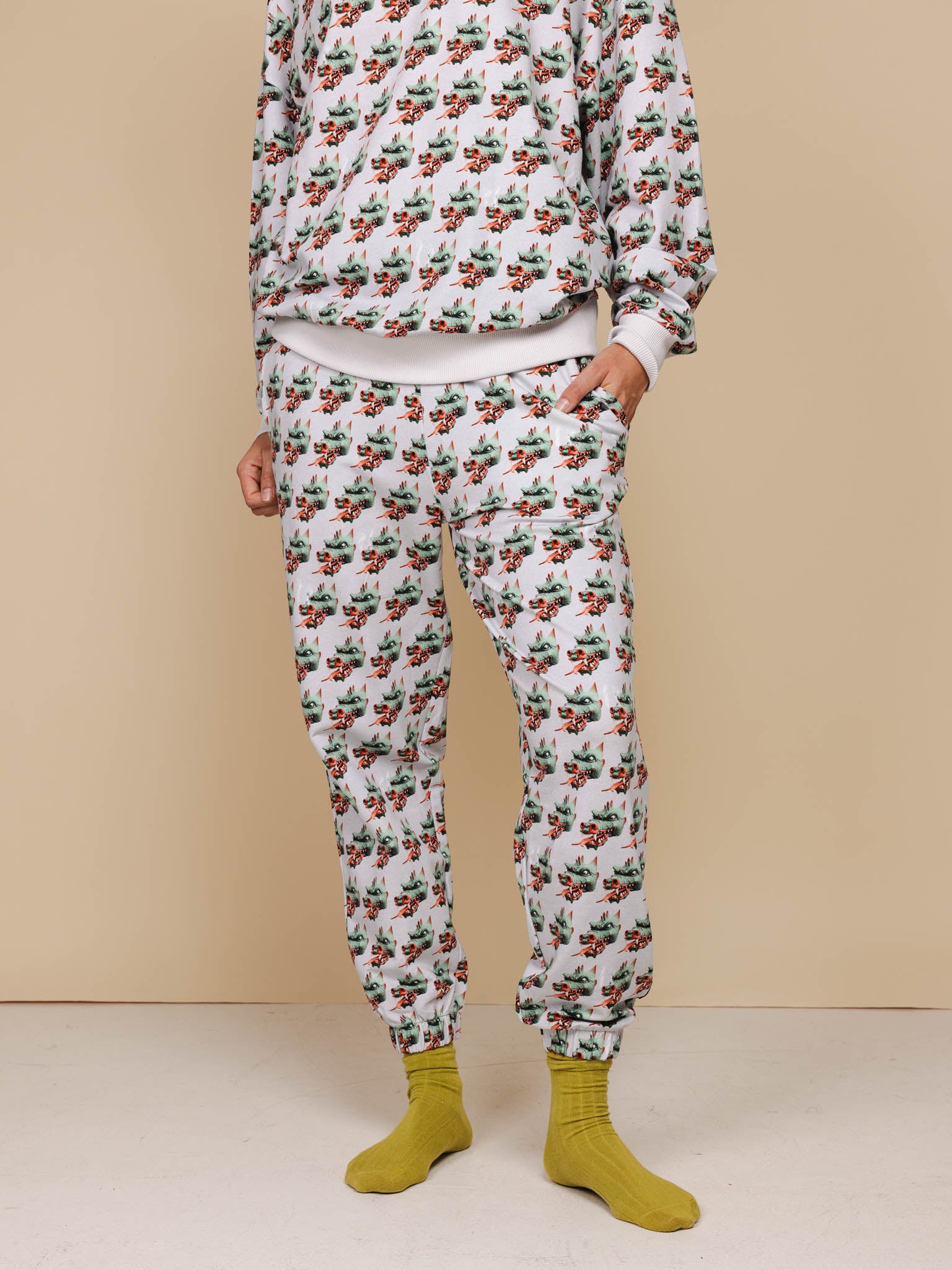 Deze legendarische schatbewaker uit het Sprookjesbos houdt alles scherp in de gaten. Zijn kop loert vanuit alle hoeken op het lichtgrijze biologische katoen. Zacht, comfy en een tikje gevaarlijk. Komt daar een klein woest wolkje uit z’n neus?