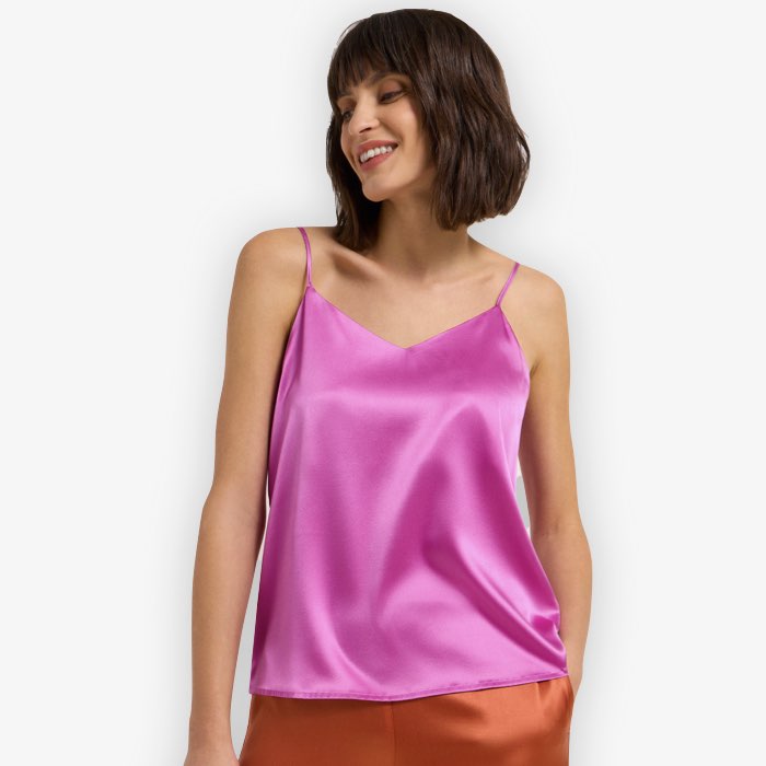 Roze satijn zijden spaghettitop van Lanius. Deze elegante top is prachtig te combineren met de bijpassende rok (bijvoorbeeld voor een bruiloft!) of met een broek. De zijden top heeft dunne bandjes en een v-hals voor en achter.