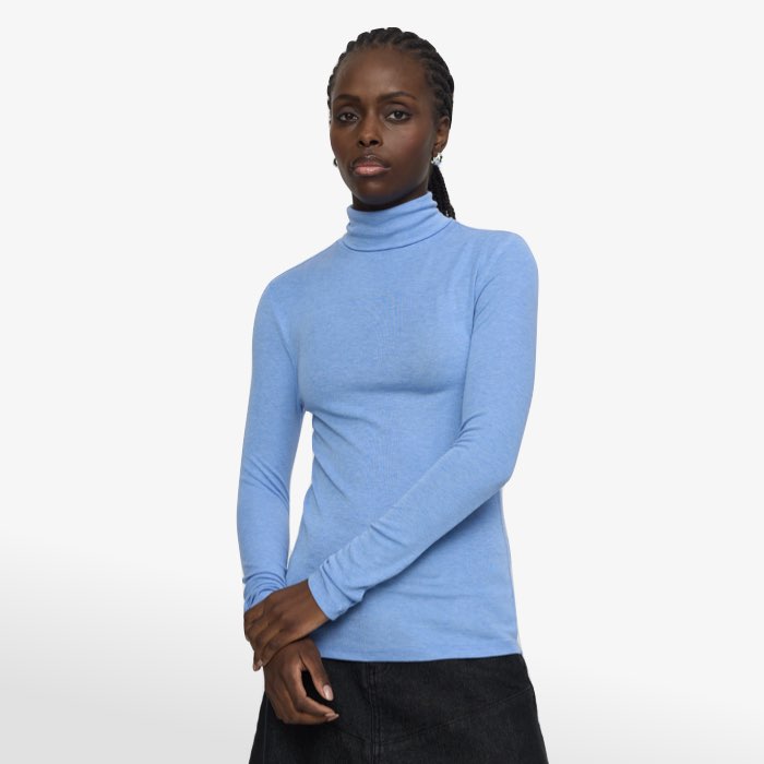 Fijne geribbeld koltruitje in lichtblauw gemeleerd. Perfect basis shirtje van heerlijk zacht Tencel.