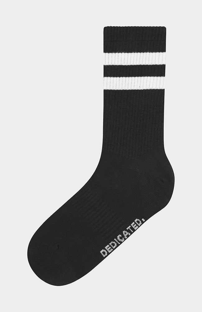 Deze retro sportsokken van het Zweedse merk Dedicated zijn gemaakt van biologisch katoen en hebben een zwarte ondergrond met twee witte strepen. De sokken hebben een geribde boord voor goede pasvorm, verstevigde teen en hiel voor extra comfort en een hoog model (crew length).