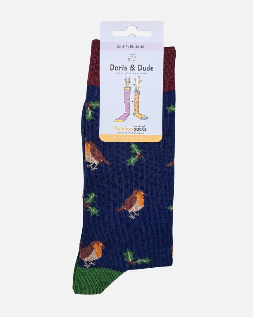 Damessokken met roodborstjes - navyMet deze navyblauwe damessokken met roodborstjes breng je direct wat vrolijkheid in je dag. De roodborstjes zitten gezellig tussen de groene hulstblaadjes, wat deze sokken een speels en bijna feestelijk tintje geeft. Wist je dat het roodborstje vaak gezien wordt als boodschapper van hoop en troost? Geen wonder dat dit vogeltje zo geliefd is in tuinen én op sokken. Deze sokken zijn verkrijgbaar in maat EU 36-40.