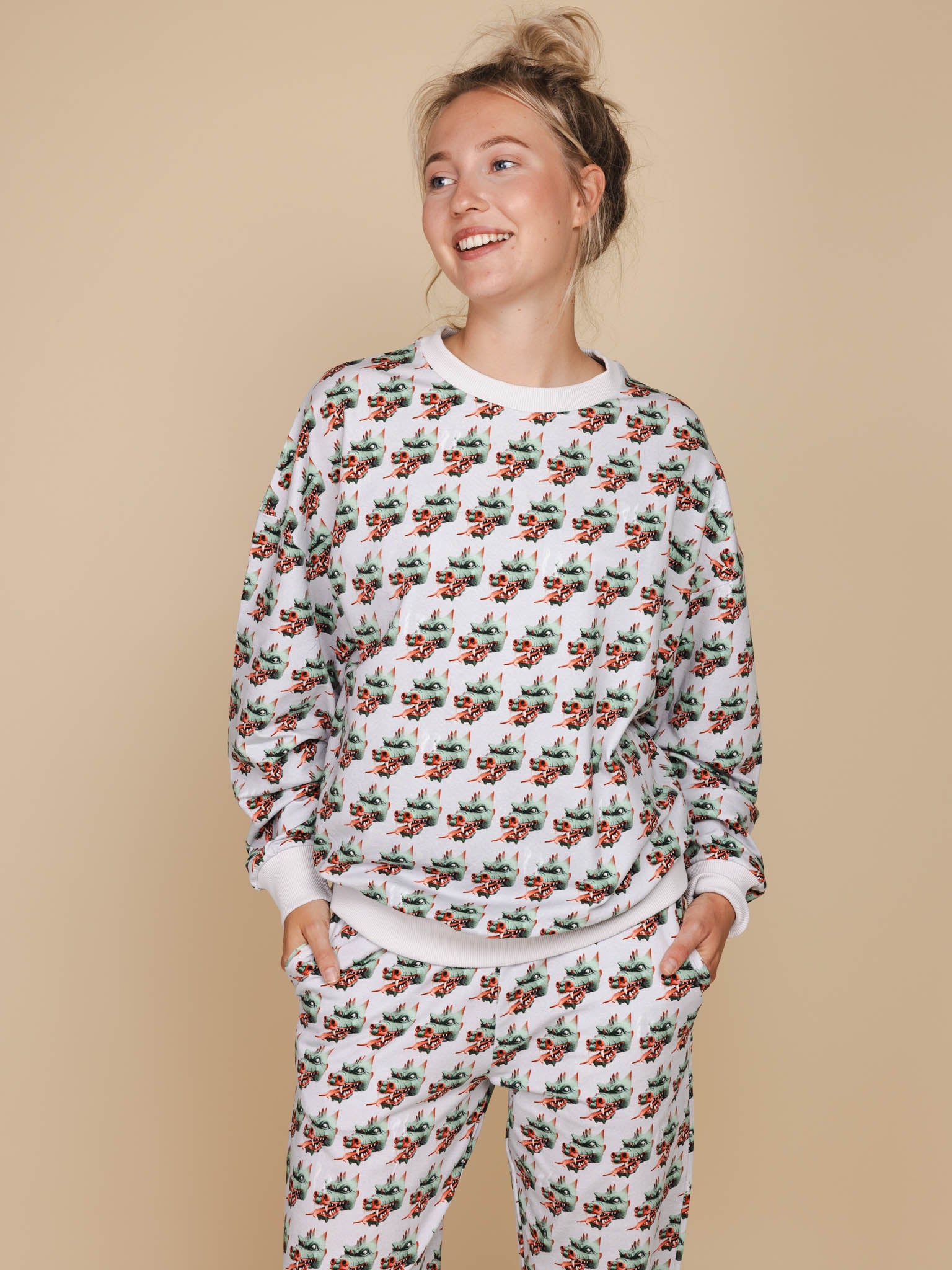 Deze legendarische schatbewaker uit het Sprookjesbos houdt alles scherp in de gaten. Zijn kop loert vanuit alle hoeken op het lichtgrijze biologische katoen. Zacht, comfy en een tikje gevaarlijk. Komt daar een klein woest wolkje uit z’n neus?