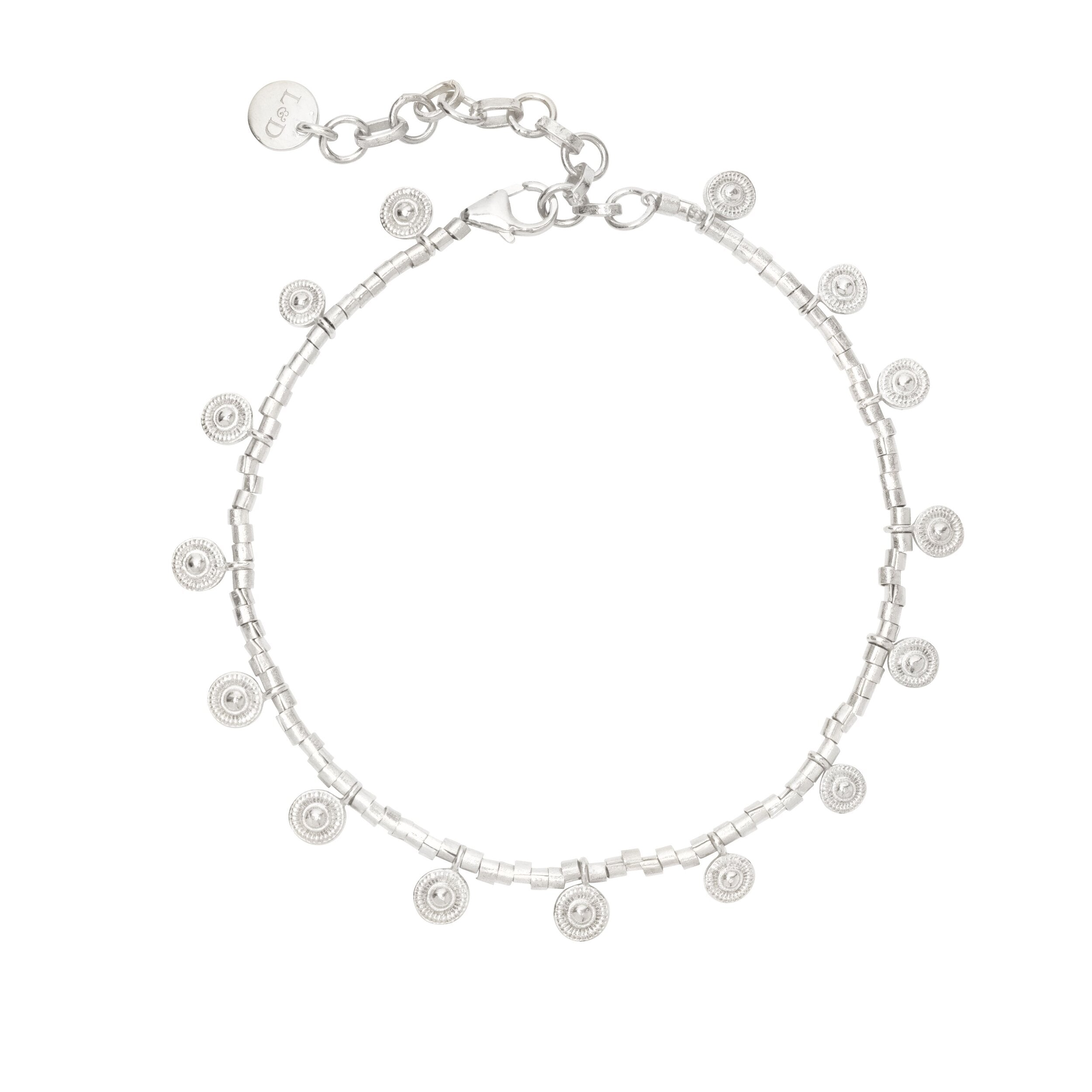 Inspired by the Bishnoi tribespeople of Rajasthan, this mini coin bracelet features 15 dainty charms, which hang from a chain of individually handcrafted beads.