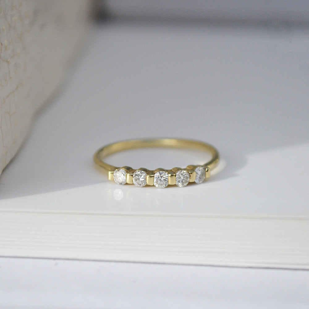 It doesn't get any more classic than this alliance diamond ring with 5 individually handset re-used diamonds. The brilliant simplicity of the white diamonds make you want to wear it every day.