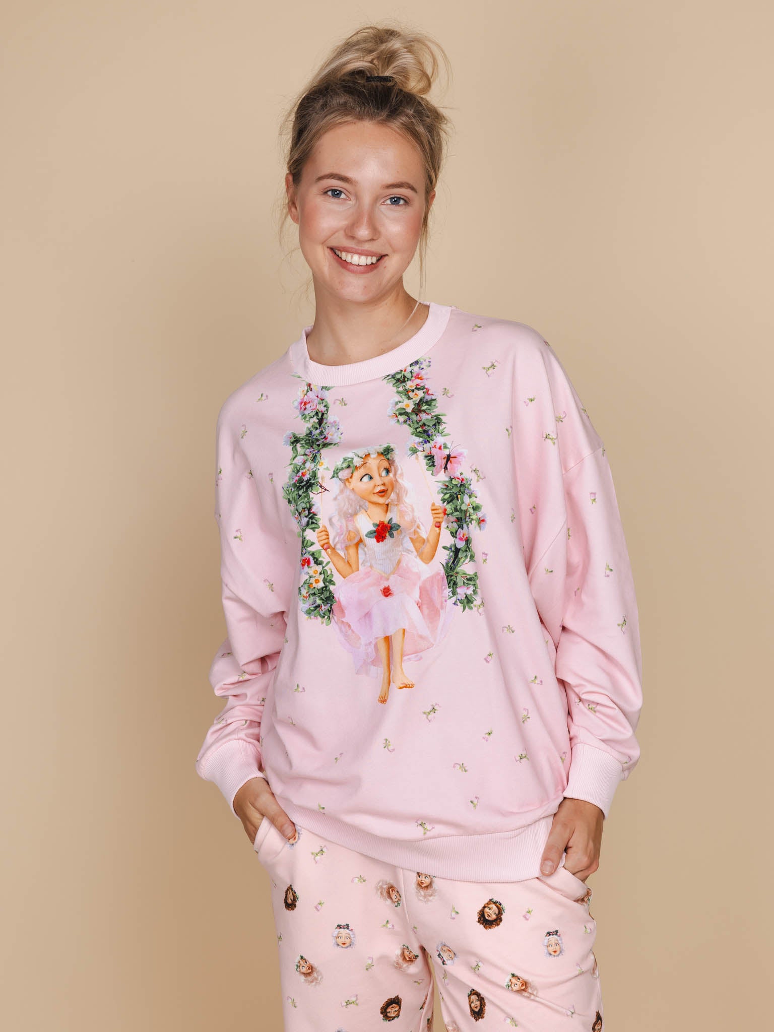 Deze zachtroze outfit brengt je naar de wereld van Droomvlucht, met zwevende elfjes, bloemenpracht en een vleugje magie. Op je broek fladderen nog meer figuren uit de elfentuin met je mee.