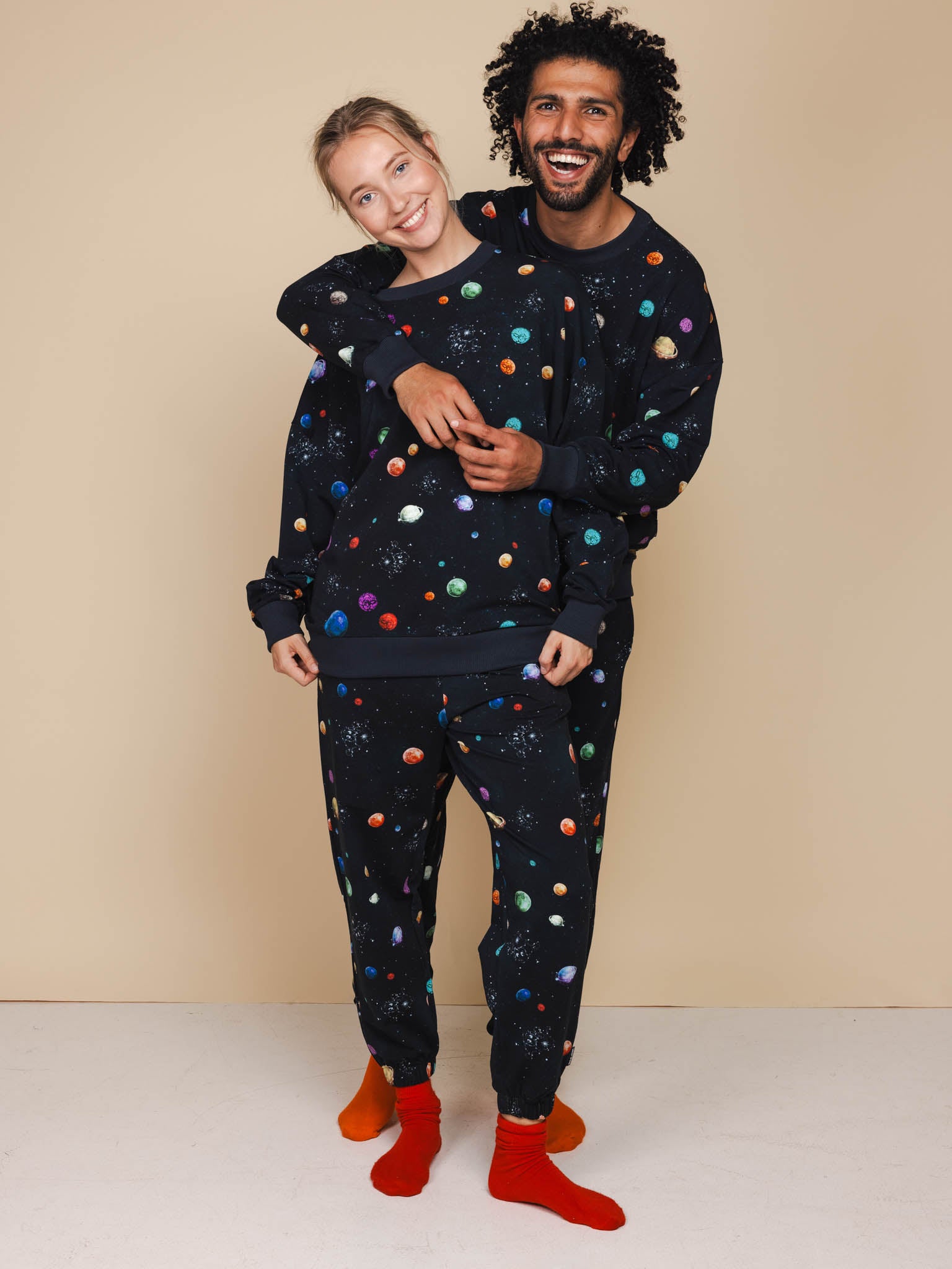 Ruimvallende unisex sweater en broek set gemaakt van 95% biologisch katoen, 5% elastaan.