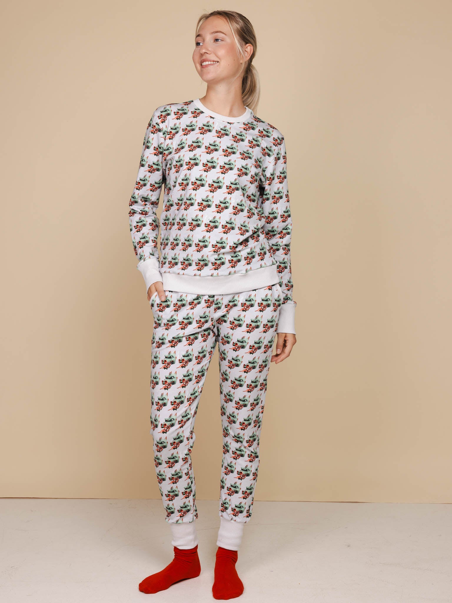 Dames sweater en broek met fotoprint gemaakt van 95% biologisch katoen, 5% elastaan.