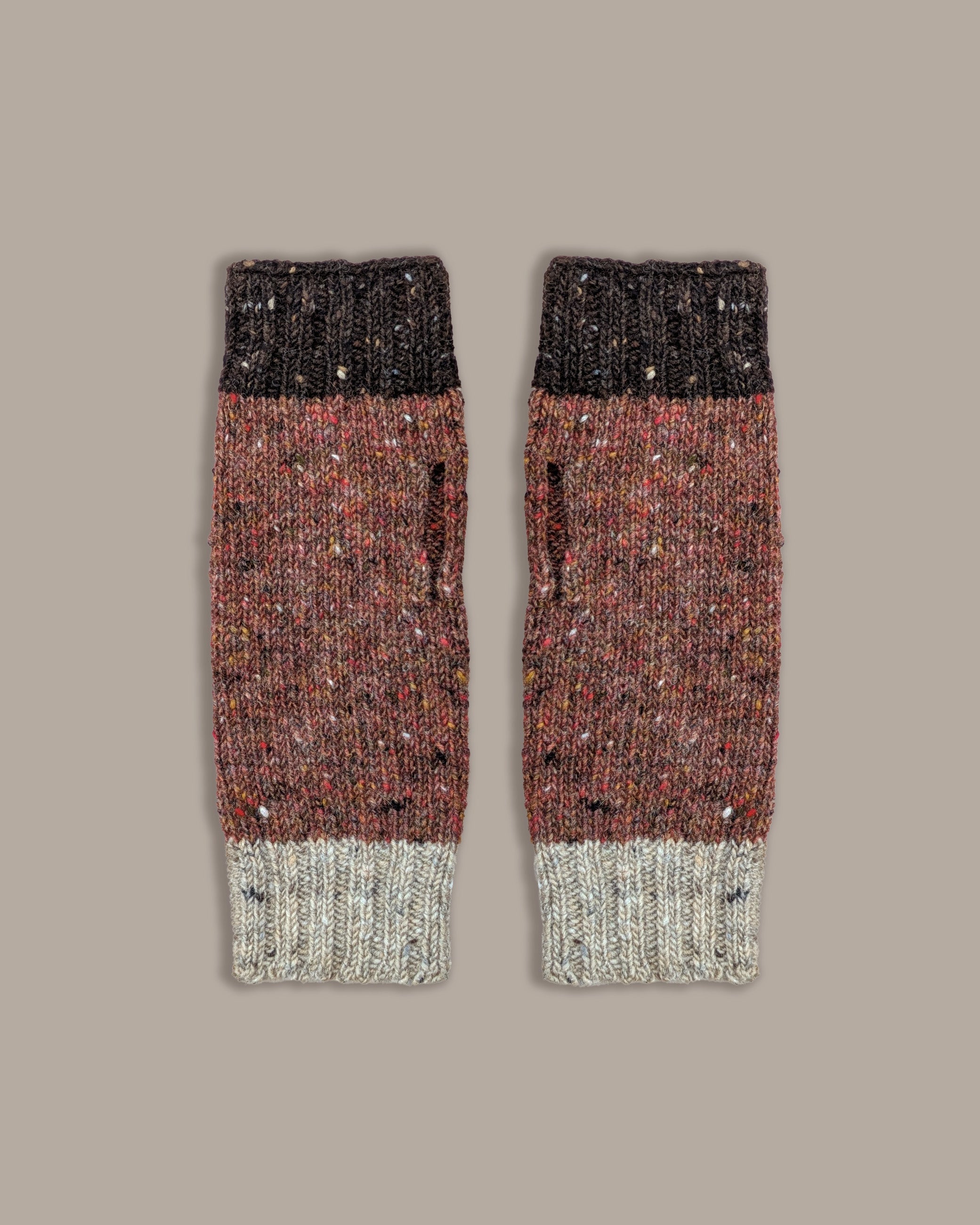 Knitted in small batches from richly textured Donegal-spun merino wool in a beautiful shade of Dusky Red with natural flecks of colour that catch the light and complement your winter layers. With soft rib cuffs in contrasting shades of Oatmeal and Brown, these mitts fit snug round your fingers and wrists to stop the cold creeping in.