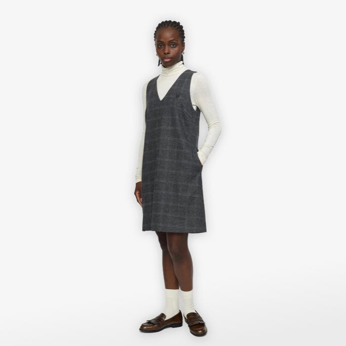 Korte grijs met blauw geruite jurk van wolmix. Dit overgooier model is een echte klassieker en op vele manieren te stylen voor elke gelegenheid. Draag de jurk met een blouse en loafers voor een klassieke look of bijvoorbeeld met een basic truitje en sneakers. Ook leuk met hoge laarzen eronder en er is ook een bijpassende korte blazer!